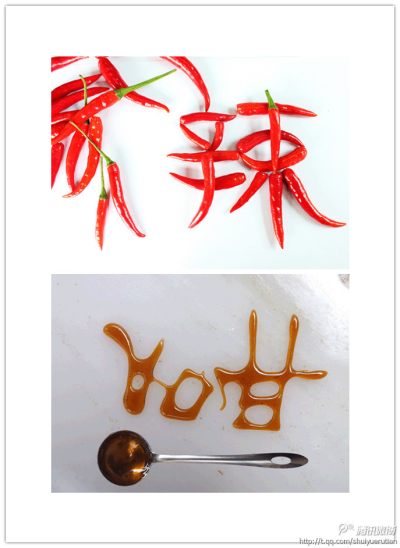 在此次参展作品中,我校师生把汉字游戏玩出了新意——汉字不仅有味道、有表情,还如同文物一样可以进行考古研究。舌尖上的文字——用食物来表现“酸甜苦辣”,是我校教师汪泽仁的创意;将篆书体的“喜怒哀乐”变形,融到带着浓厚地方特色的脸谱作品则是由文博学院2013级陈妍璇完成;我校文博学院汉字文化研究中心首席研究员金星创作了近26幅作品,研究汉字20多年的金老师多用甲骨文来进行创作,使每一幅作品都充满了深厚的文化底蕴。