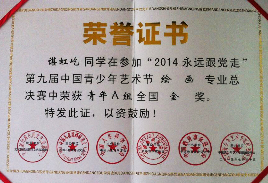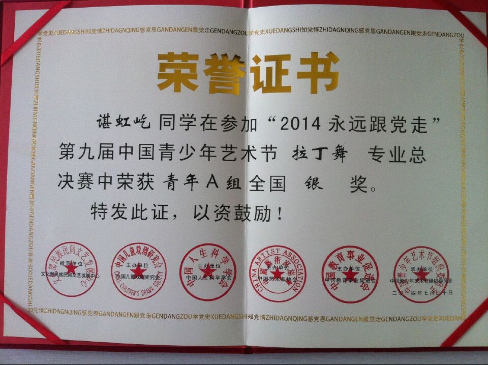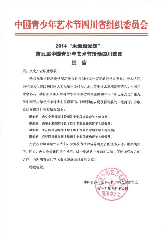 我校2012级动漫设计与制作专业学生谌虹屹同学在四川省的初赛和复赛中以两项省级银奖的资格闯入了总决赛,与来自全国各地包括港澳台及海外的选手同台竞技,荣获了全国书画〖绘画〗专业总评选青年A组金奖以及全国舞蹈〖拉丁舞〗专业总评选青年A组银奖两项大奖,被中国艺术家协会授予全国优秀艺术人才奖章,为学校争得了荣誉。为此,中国青少年艺术节四川省组织委员会特地发来贺信,祝贺我校在比赛中取得的优异成绩。