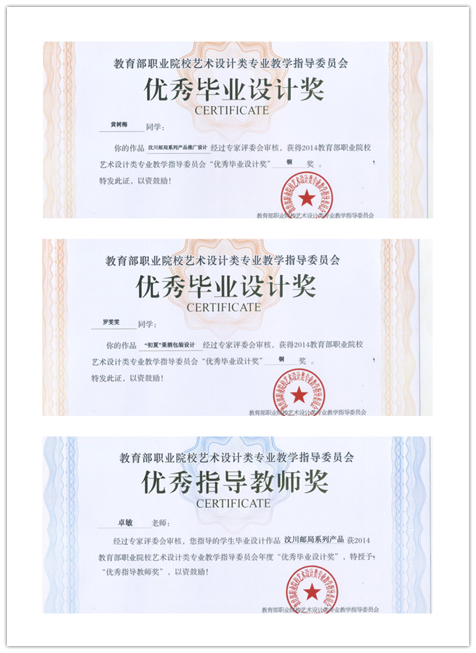 由我校数码学院卓敏老师指导的《“初夏”果酒包装设计》(罗雯雯同学设计)、《汶川邮局系列产品推广设计》(黄树梅同学)作品荣获铜奖;由罗加师指导的《如意柿饼系列包装设计》(蒋镇宇同学设计)、《“汇源”海报设计》(林伍强同学设计)荣获优秀奖;卓敏老师荣获“优秀教师指导奖金”。