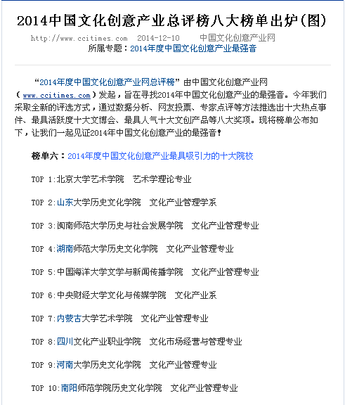 2014年12月,全球中文第一大文化创意产业门户网站——中国文化创意产业网揭晓了2014年度中国文化创意产业最具吸引力十大院校。我校文化市场经营与管理专业成功入围,我校作为全国唯一一所高职院校与北京大学、山东大学、中央财经大学等本科院校共享殊荣。