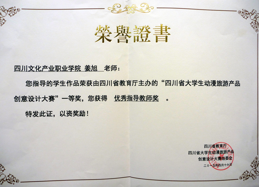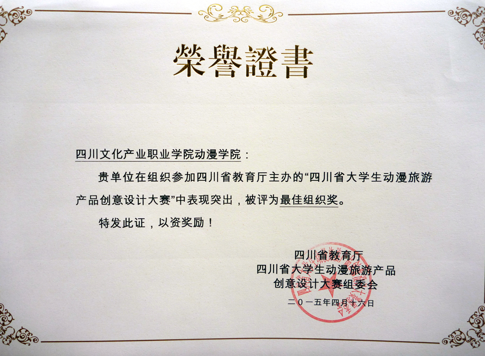 据省教育厅《2014年省级大学生竞赛项目获奖名单的通知》(川教函〔2015〕165号),我校动漫设计与制作专业学生张钰茜、李飘,教师姜旭荣在省教育厅主办的第二届四川省大学生动漫旅游产品创意设计大赛中,包揽了高职组全部一等奖、唯一优秀指导教师奖,我校荣获最佳组织奖。
