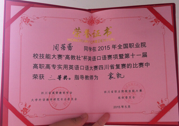 5月9日,在第十一届全国高职高专实用英语口语大赛中,我校14级摄影摄像专业学生周蓓蕾获得三等奖。