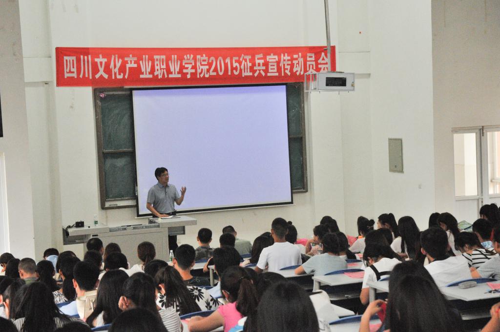 5月14日下午,我校2015年大学生应征入伍宣传动员会和咨询会在三教213多媒体教室举行,现场座无虚席。副院长曹启富、双流县人民武装部政委黄庆华出席并讲话。