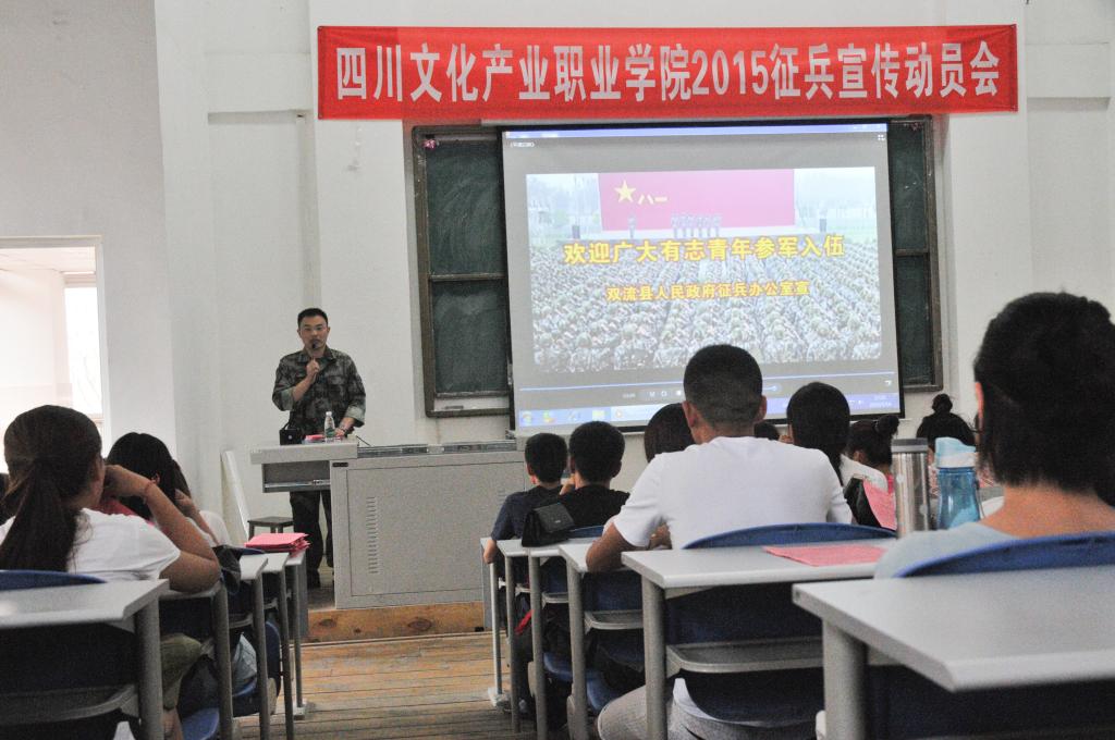 会上,双流县人民武装部播放了征兵宣传短片。黄庆华政委作宣传动员讲话,对大专生应征入伍的意义、政策及有关程序做了详细讲解。会后,双流武装部征兵办李强科长耐心回答了同学们有关征兵工作的各类问题。