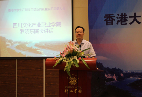 我校校党委副书记、院长罗晓东作为本次香港大学生在川实习合作承办院校代表进行了发言。他首先向与会嘉宾介绍了我校与香港高校合作的学生交流项目“文产学子香港行”的开展情况以及今年对口接待香港高校学生来川交流实习的情况。他表示,香港高校学生来川实习,真实感受了内地的职场文化,领略了不同职业环境对竞争能力、适应能力的相应要求。举办川港大学生互访与交流,为川港两地的教育文化培育了新苗,培养出的具有两地视野的青年才俊将成为未来50年内地香港文化交流的栋梁之才。此项目是川港两地教育互融互通的新平台,为两地教育对接打开了窗口,通过青年学子的深度交流,必将增进对国家、历史、民族、文化的认同,他希望通过教育者们的不懈努力,为两地广大青年学子提供更广阔发展空间!