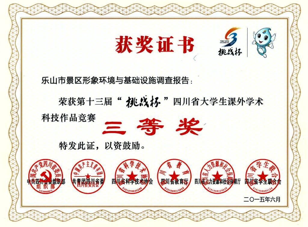 在第十三届“挑战杯”四川省大学生课外科技作品竞赛中,由我校动漫学院辅导员王毓老师指导,2013级多媒体设计与制作专业学生任成曦撰写的《乐山市景区形象环境与基础设施调查报告》论文作为全校唯一一件送选作品荣获全省三等奖。
