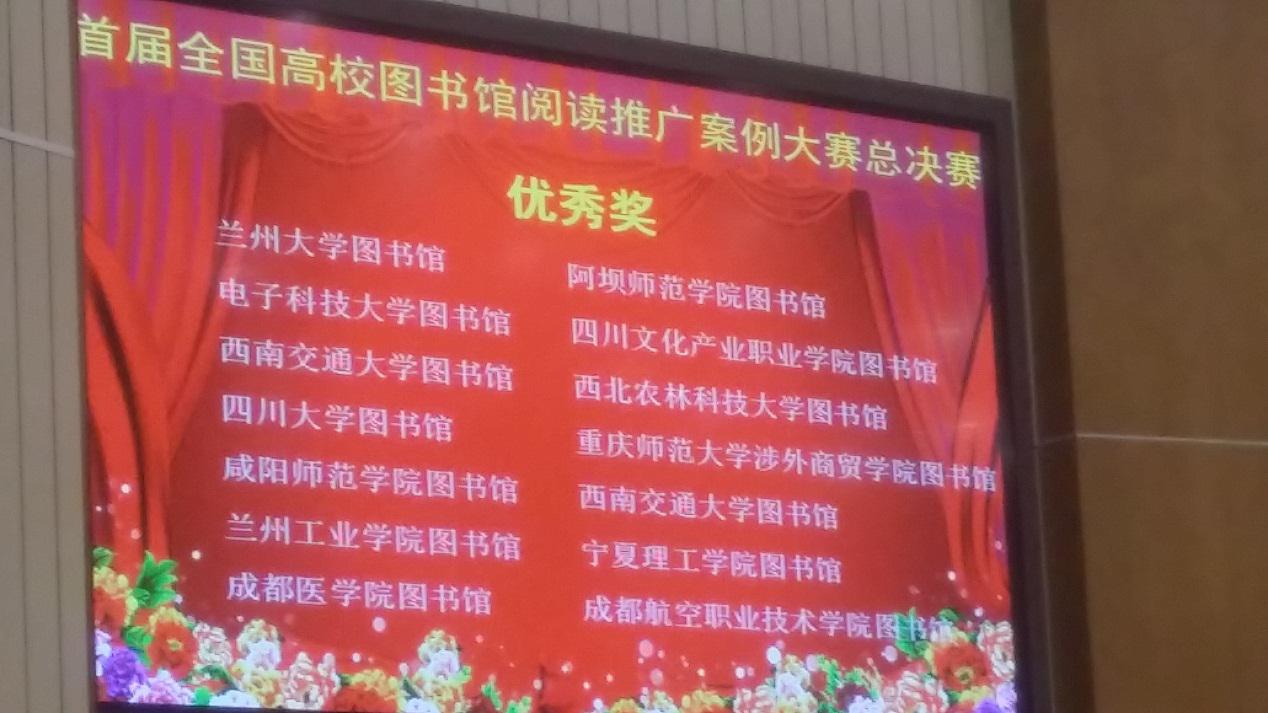 10月16日,首届全国高校图书馆阅读推广案例大赛全国总决赛暨研讨会于10月16日在华中师范大学举行,四川赛区以1个一等奖、1个三等奖和8个优秀奖的总成绩载誉而归。我校图书馆选送案例《告别前,一位老教授的知心话》与成都航空职业技术学院案例《高职院校图书馆大学生自主阅读选修课实践与发展》作为省内高职院校图书馆案例代表分获此次决赛优秀奖。