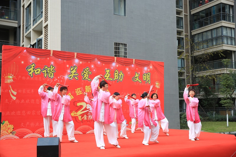 随后进行了文艺表演,女声独唱、业主自编自演的扇子舞、物业工作人员带来的走秀和集体大合唱等节目陆续登场,一位80多岁高龄的业主表演的太极剑赢得了阵阵掌声。期间,物业公司还设置了抽奖、趣味竞技等游戏环节,增添不少乐趣。活动期间欢声笑语不断,展现了文产物业与业主之间融洽和谐的氛围。