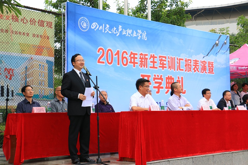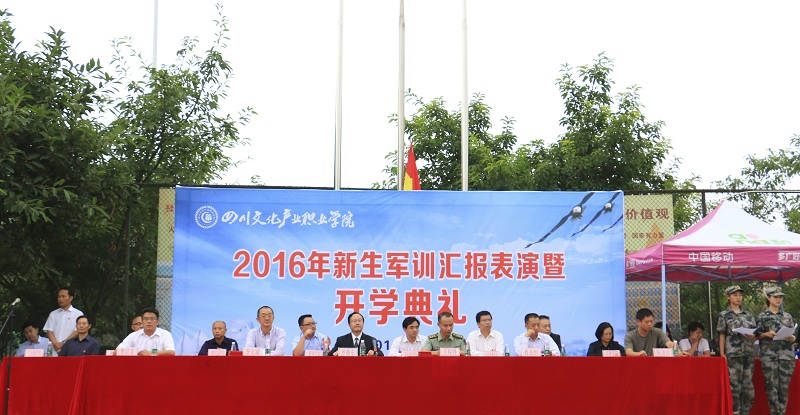 9月25日下午,军歌嘹亮,步伐铿锵,我校2016级新生开学典礼暨军训汇报表演在足球场举行。第一阶段的军训汇报表演由军训团参谋长贺建主持,第二阶段的开学典礼由副院长肖必恒主持,我校领导罗晓东、肖必恒、李太斌、曹启富,以及承训方领导等出席。