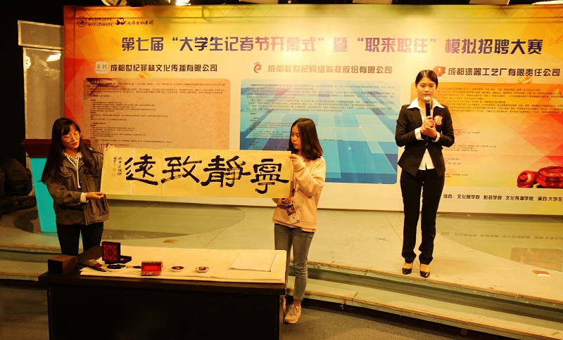 从500余份报名简历中脱颖而出的18位选手,在比赛现场对6个应聘职位展开了激烈竞逐。参赛选手结合精心制作的简历、PPT,向企业招聘方讲述了学习和工作经历,阐释了自己对应聘职位的认知。企业方针对学生的自我陈述进行了现场提问,参赛选手冷静、机智的作答,赢得了招聘方和观众的阵阵喝彩。来自动漫学院2014级产品设计专业的汪依琳凭借优秀的临场表现和现场书法写作获得了评委们的一致青睐。