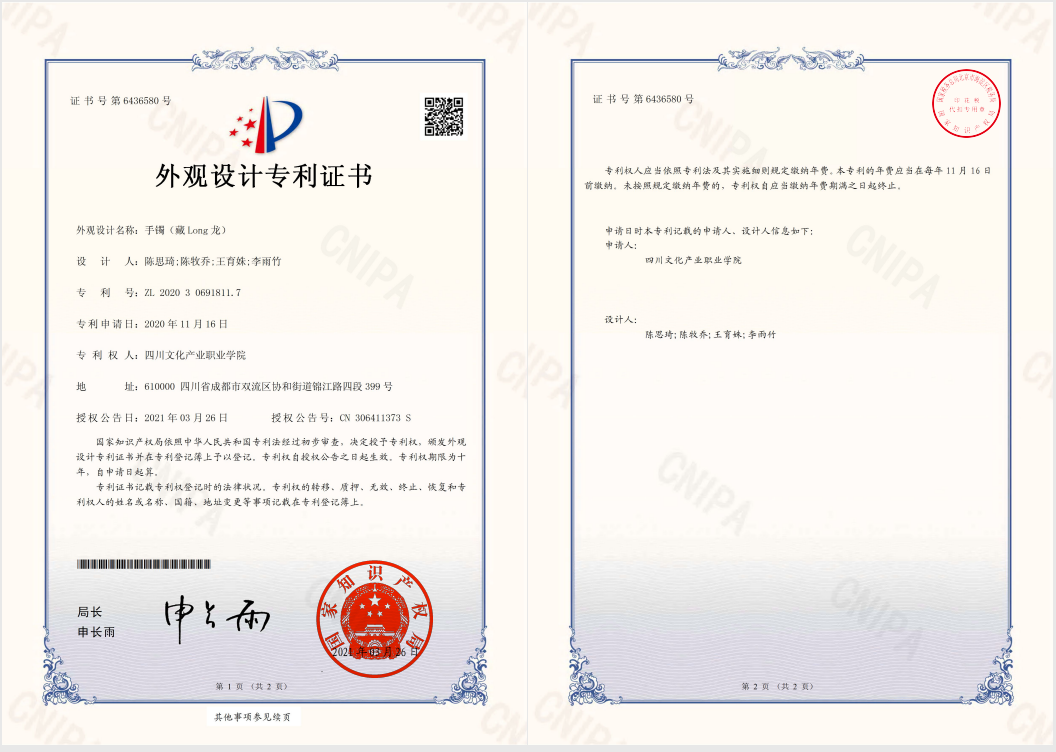 非遗与巴蜀文化学院认真贯彻落实学校第一次党代会精神,大力推进实用新型技术研发,取得显著成效。近日,非遗与巴蜀文化学院教师团队申报的《同一轮月亮系列》《藏long龙系列》共计17件设计作品成功荣获国家知识产权局外观设计专利授权,另14件设计作品将近期获得专利授权。