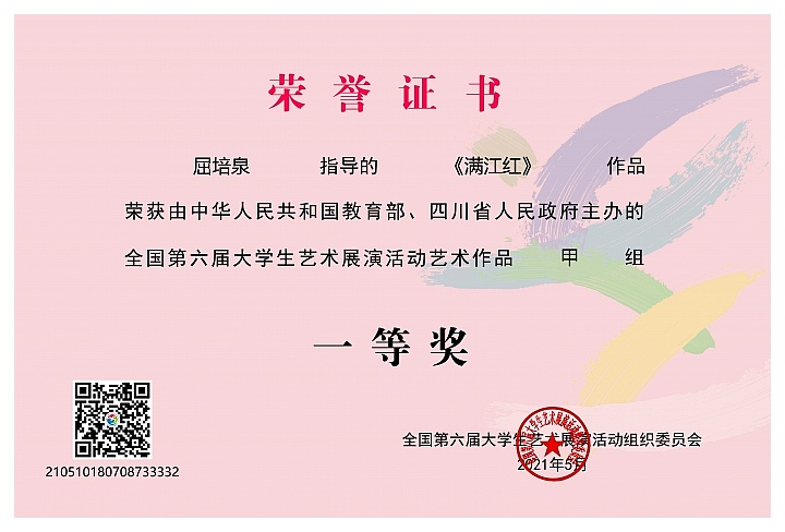 5月13日,由教育部和四川省人民政府主办的全国第六届大学生艺术展演活动在成都圆满落幕。此次展演中,由我校数字艺术学院屈培泉老师指导,学生冯艳创作的书法作品《满江红》斩获大学生艺术作品甲组一等奖。该作品作为四川省第九届大学生艺术展演活动书法篆刻组一等奖,被选送到全国参展。