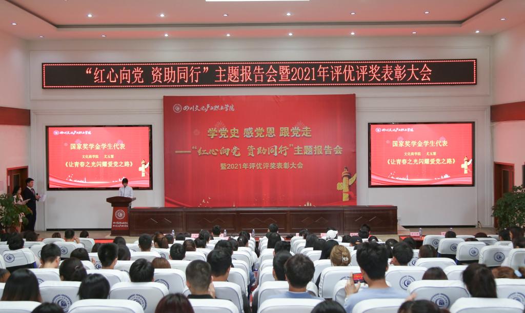学生工作部部长黄自立向大会作了2021年“红心向党 资助同行”主题系列活动开展的工作报告。国家奖学金学生代表尤玉慧、国家励志奖学金学生代表唐媱、国家助学金学生代表杨洪英等三位同学结合前期党史学习教育,分别作了《让青春之光闪耀爱党之路》《感恩感党走、青春正当时》《学党史跟党走、忆资助感党恩》的主题报告发言。为了展现当代大学生自强不息、砥砺奋进为实现中华民族伟大复兴的中国梦不懈努力的精神风貌、传递党和政府对当代大学生的关心关爱,大会通过主题微视频展播,以学生喜闻乐见的形式对优秀学生先进典型事迹和国家资助政策体系进行了展示。