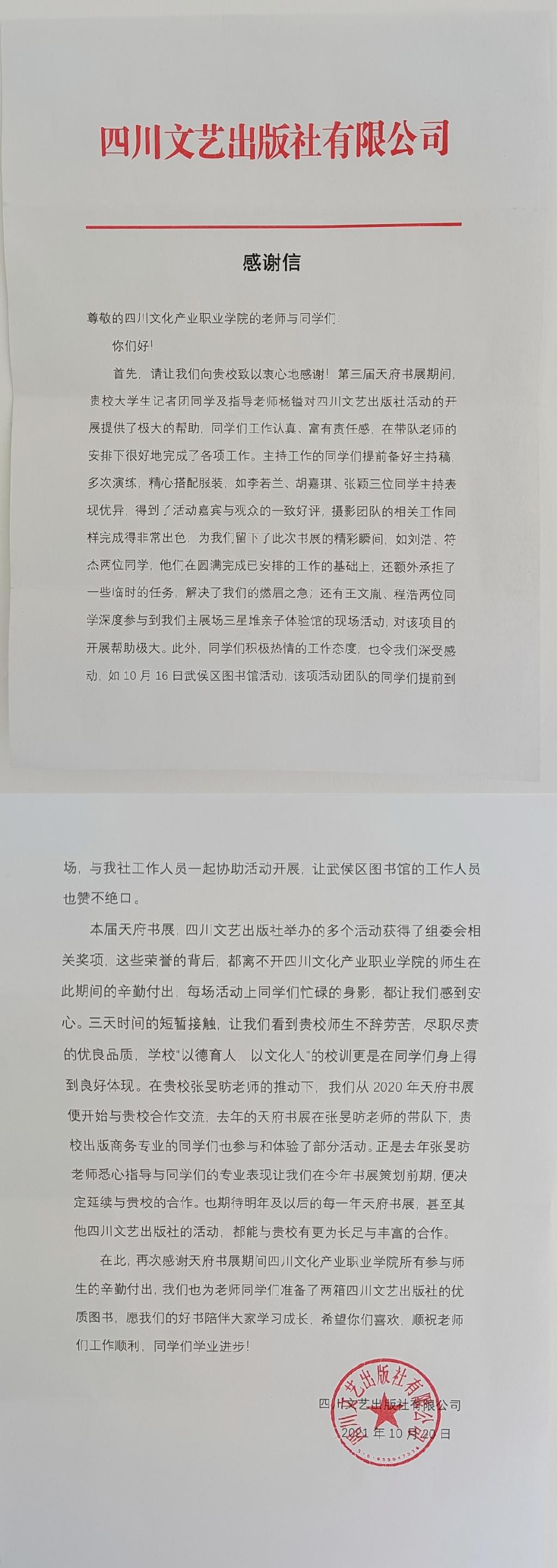 袁庭栋与毛岸羲两位作家是继2020天府书展后第二次与我校学生合作,他们表扬主持人功底扎实,台风稳健;参加《世纪辉煌:百年党史中的成华记忆》首发式的成华区作协主席张义奇也对首次担任主持人的何姗同学表示肯定,并鼓励她多参加此类活动;导购组程浩、王文胤同学展现出的良好素质也获得书展顾客的一致好评;大学生记者团技术中心承担了7场活动的摄影工作,过硬的专业能力和优质的图片得到了主办方认可。四川文艺出版社营销部副主任骆赟多说:“面对天府书展活动多、时间紧、防疫工作要求高、人员配置不足的挑战,四川文化产业职业学院师生积极参与、表现优秀,希望贵校学生通过此次活动能够得到锻炼,了解行业信息,提高实践能力。”活动结束后,四川文艺出版社还向我校参加天府书展的师生赠书并送上了感谢信。