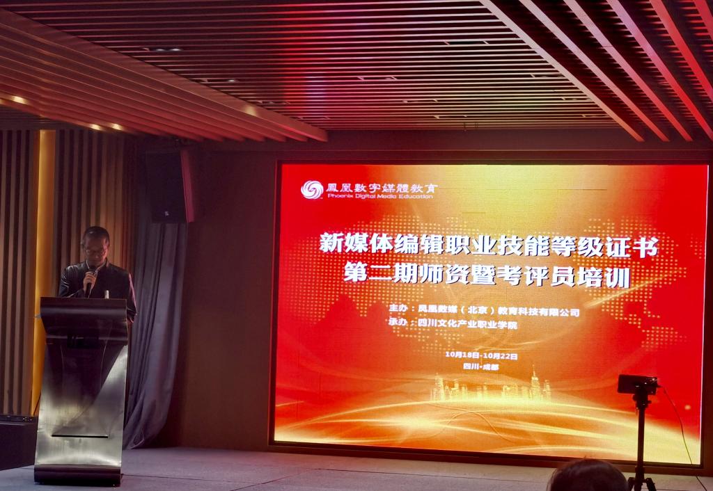 为深入贯彻《国家职业教育改革实施方案》精神,落实《关于在院校实施“学历证书+若干职业技能等级证书”制度试点方案》、《关于组织开展1+X证书试点院校教师培训的通知》要求,高质量开展新媒体编辑职业技能等级证书试点工作,四川文化产业职业学院联合凤凰数媒(北京)教育科技有限公司于10月18日在成都金牛智选假日酒店开展的2021年第二期新媒体编制职业技能等级证书师资培训和考评员培训工作启动。四川文化产业职业学院党委委员、副院长李太斌出席开班仪式并发表讲话。