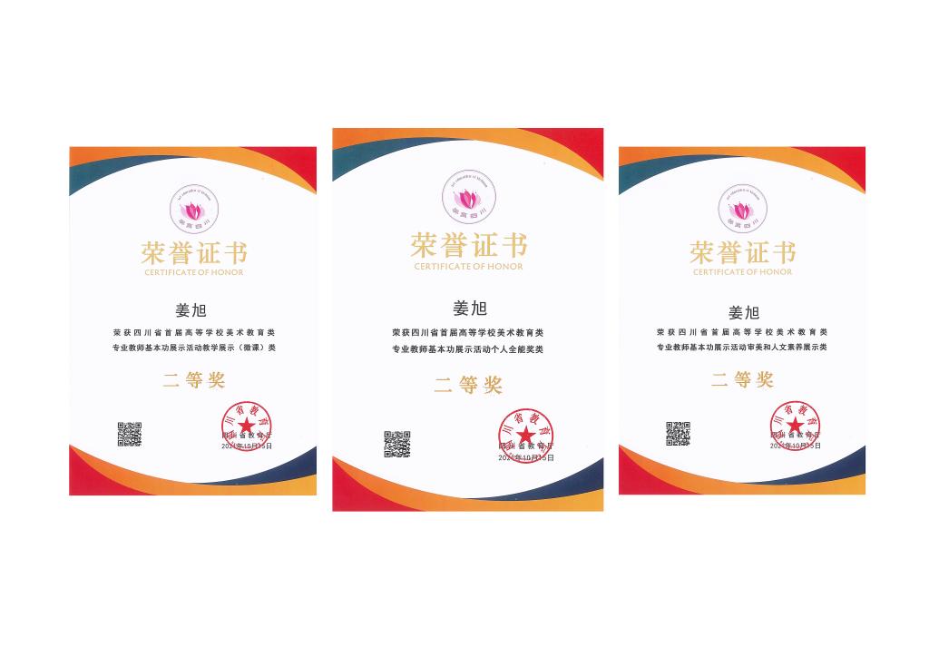 10月15日,由四川省教育厅主办的四川省首届高等学校美术教育类专业教师基本功展示活动在成都师范学院落下帷幕,我校非遗与巴蜀文化学院姜旭老师获得教学展示二等奖、审美和人文素养展示二等奖、专业技能展示三等奖,最终荣获个人全能二等奖。