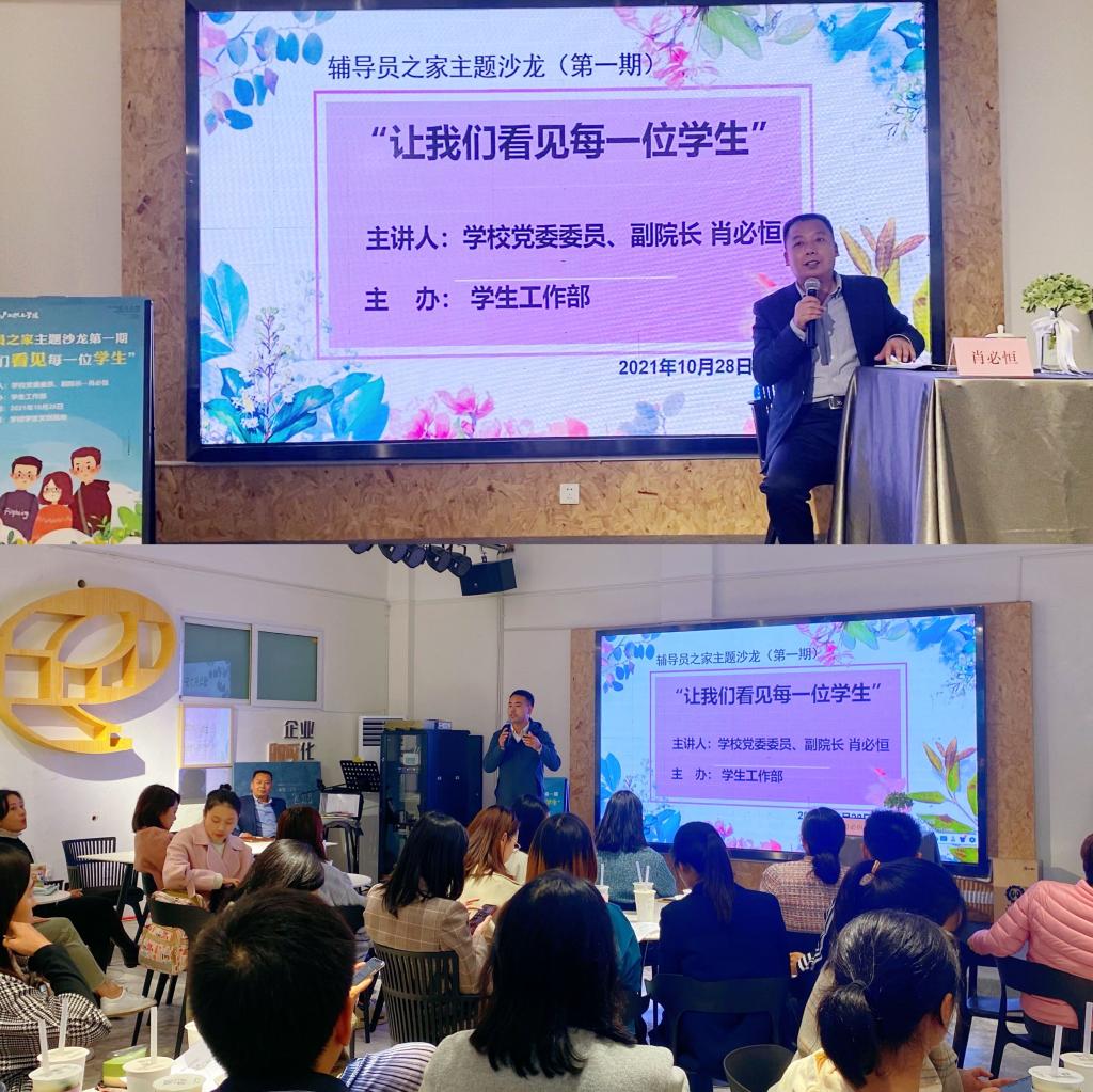 为进一步强化我校专职辅导员队伍建设,加强辅导员工作交流研讨,提升业务工作能力水平,学生工作部结合工作实际,以“工作坊”的形式打造“辅导员之家”工作交流平台开展交流活动。10月28日下午,学生工作部组织全校专职辅导员在学校文创基地开展“辅导员之家”主题沙龙,学校党委委员、副院长肖必恒出席活动并做主题讲座。