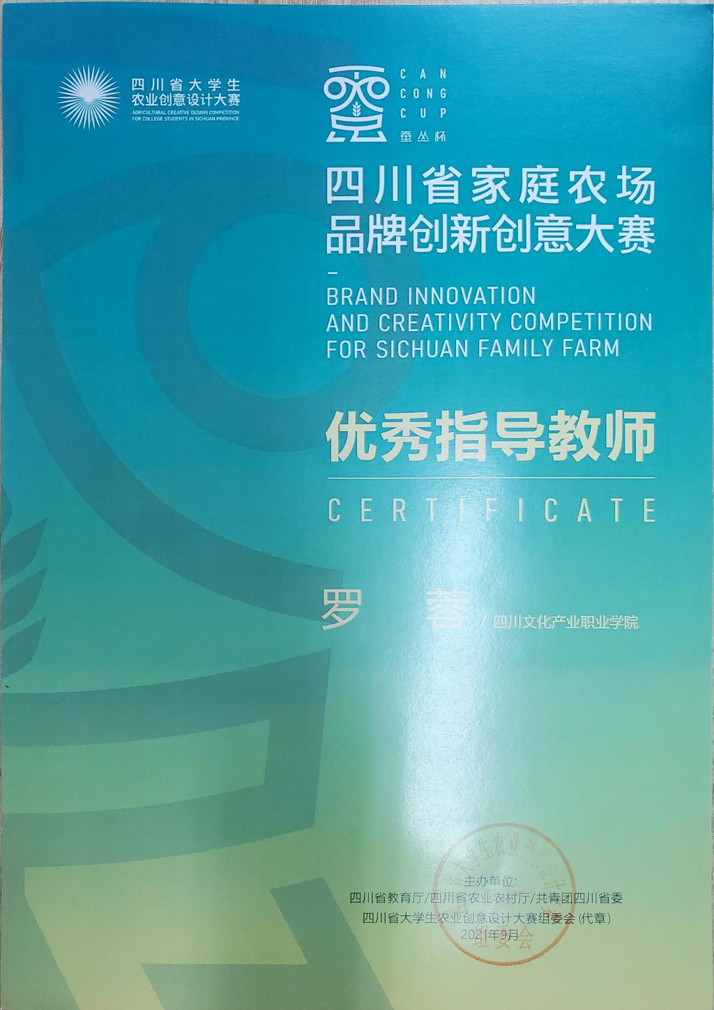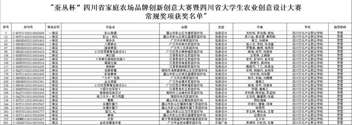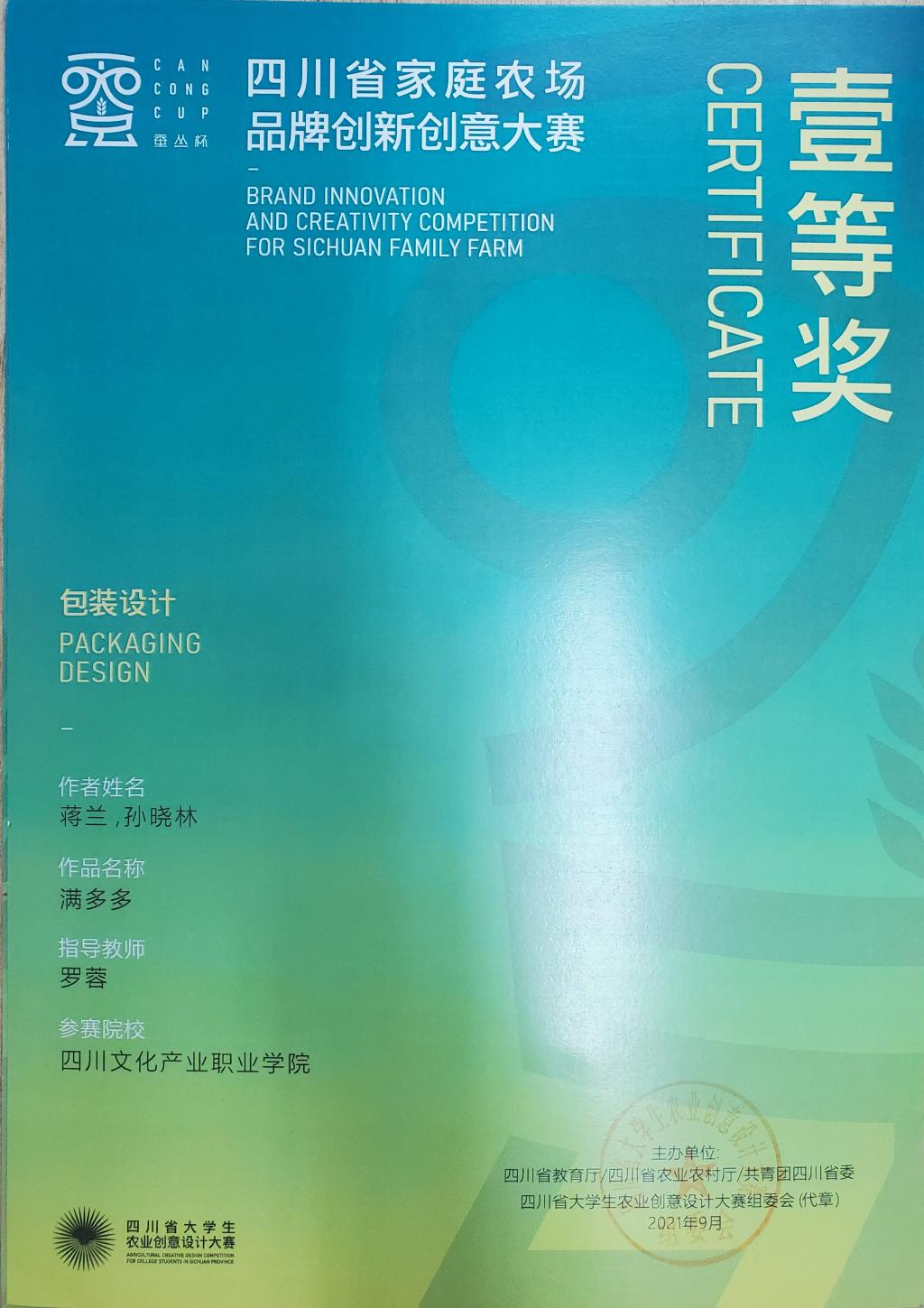 2021年12月10日,“蚕丛杯”四川省家庭农场品牌创新创意大赛暨四川省大学生农业创意设计大赛决赛在四川农业大学温江校区举行。我校产品设计专业选送的《满多多》等25项师生作品喜获一等奖3项,二等奖10项,三等奖12项。政府奖项二等奖1项,政府奖项三等奖2项;产品专业教师罗蓉荣获“优秀指导教师”称号。