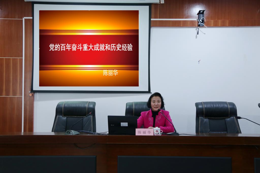 陈丽华重点围绕深刻认识党的百年奋斗的初心使命和重大成就、新时代党的理论创新和实践成就、党的百年奋斗的历史意义和历史经验三个方面,系统阐述了《决议》的基本框架和主要内容,对“两个确立”、马克思主义中国化新的飞跃、四个历史时期、五大历史意义、“十个明确”、十条历史经验等内容进行了深入的解读。她指出,党的十九届六中全会是在我们党百年华诞的重要时刻,在“两个一百年”奋斗目标历史交汇关键节点上召开的一次重要会议。《决议》聚焦总结中国共产党的百年奋斗重大成就和历史经验,突出中国特色社会主义新时代这个重点,全面总结了中国共产党百年奋斗的历史经验,对推动全党进一步统一思想、统一意志、统一行动,在新时代更好开创党和国家事业新局面,具有重大现实意义和深远历史意义。她强调,学校各民主党派人士和无党派代表要深入学习全会精神,深刻领悟“两个确立”的决定性意义,始终坚持中国共产党的领导,与中国共产党想在一起、干在一起,发挥各自组织优势,准确把握“坚持统一战线”这一历史经验的重大意义和实践要求,切实发挥统一战线重要法宝作用,在为党育人、为国育才和推动学校高质量发展中做出贡献。