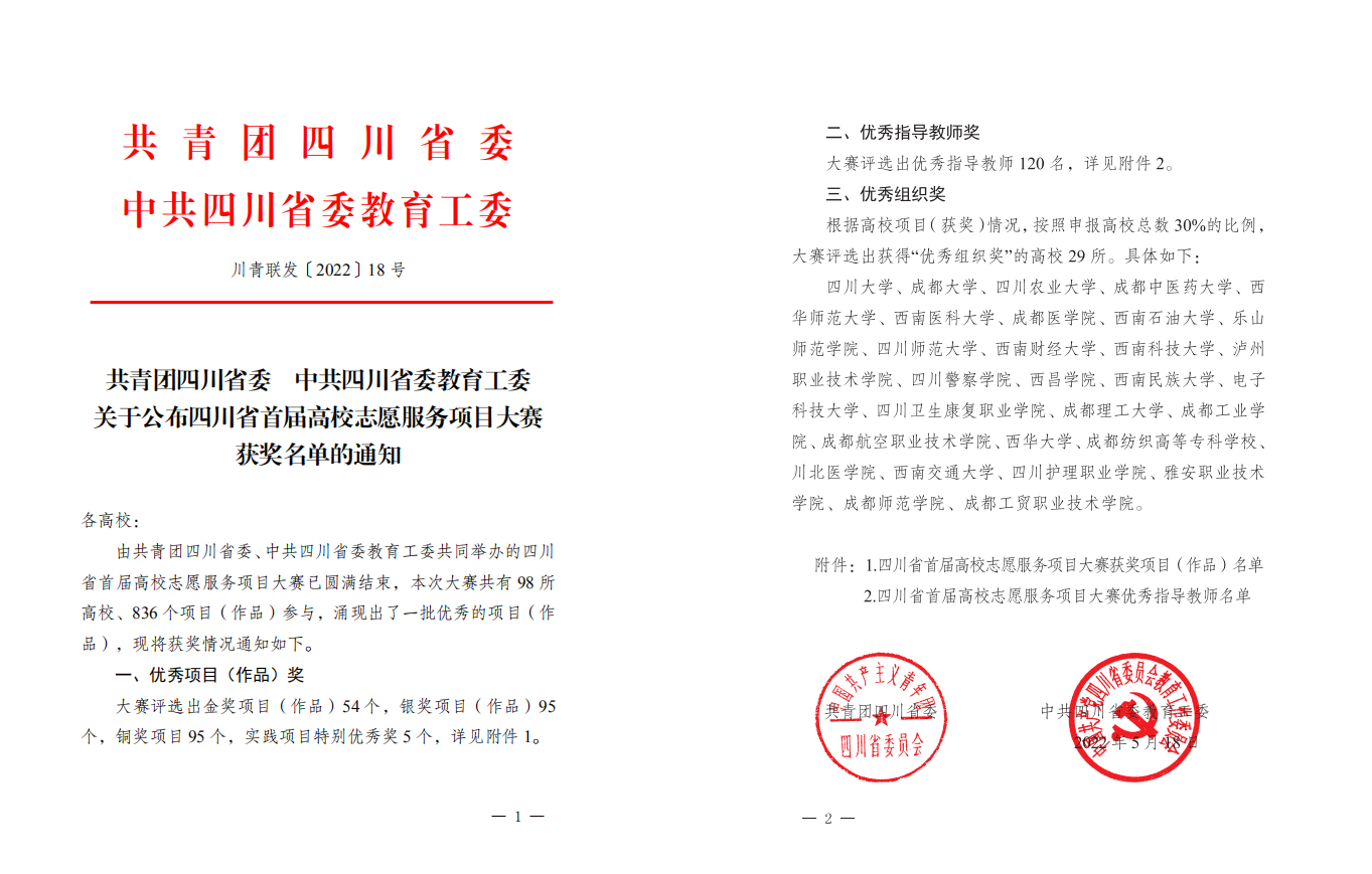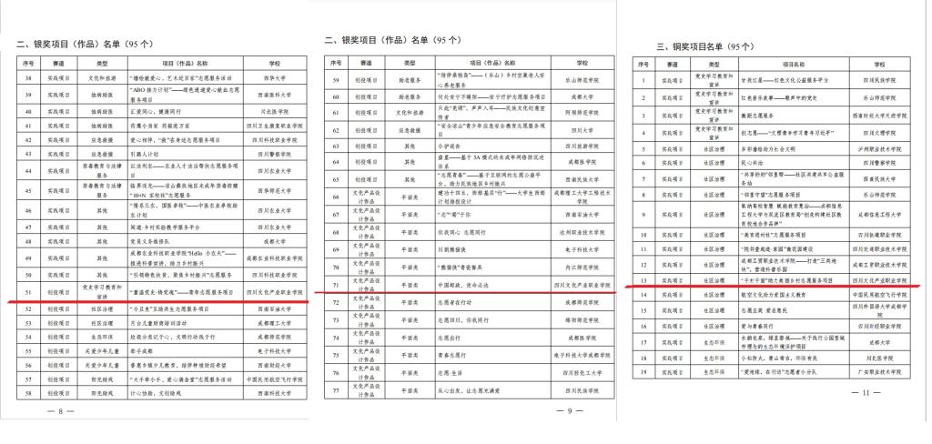 日前,由共青团四川省委、中共四川省委教育工委共同举办的四川省首届高校志愿服务项目大赛圆满结束。我校共推报15个优秀志愿服务项目推报参加省级比赛,通过项目团队线上路演答辩、评委监委线下集中评审等环节,最终获得银奖2个,铜奖1个。