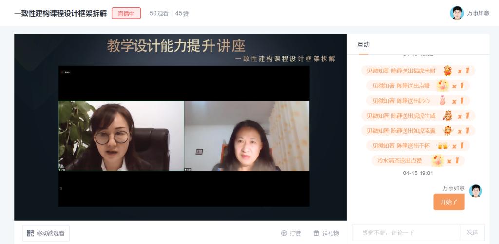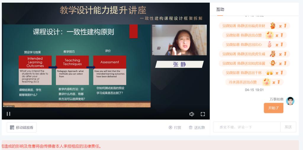 讲座专家张静,中国教育发展战略学会艺术教育专业委员会常务理事、欧盟创新能力框架先锋师资、创展英国中国唯一合作伙伴,曾任英国驻华大使馆文化教育处高等教育总监,针对课程、专题讲座如何设计,深入浅出用生活化、形象化的语言,阐述打破“以教学内容、以教师为中心”的传统做法,取而代之以成果导向教育(OBE)反向设计,一切“以学员为中心”、以学员学习成果为导向的课程设计理念,让人耳目一新,线上学习人数143人。