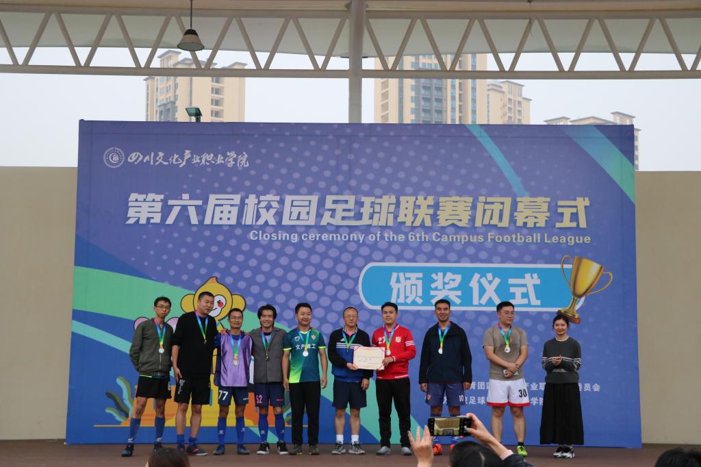 在闭幕式暨颁奖仪式上,校团委副书记邓智文代表主办方作赛事总结发言。校足球队指导老师邹渝、校团委侯冠华老师分别颁发优秀裁判、最佳裁判员、最佳守门员、最佳射手以及体育道德风尚奖,校团委书记兰楠、校团委副书记邓智文分别为亚军、季军球队颁奖。学校党委委员、副院长肖必恒为获得冠军的文化旅游学院颁发奖牌和奖杯。肖院长向获得奖项的个人和球队表示祝贺,并希望同学们以本届足球联赛为契机,把团结协作、努力拼搏、勇攀高峰、催人奋进的比赛精神转化为强大的学习和工作动力,为美好的未来而不断努力奋斗。