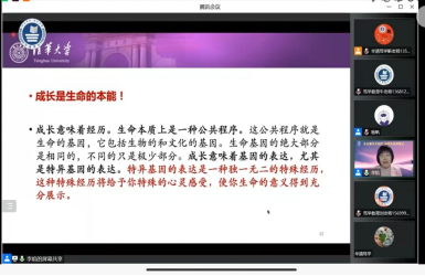 10月19日晚,随着学生逐批次返校开展校园生活,学生工作部大学生心理健康中心组织学生学习由清华大学学生心理发展指导中心主任李焰教授主讲的“生如夏花之绚烂——追寻生命的意义”生命安全线上公开课,全体学生在线学习了本次课程。