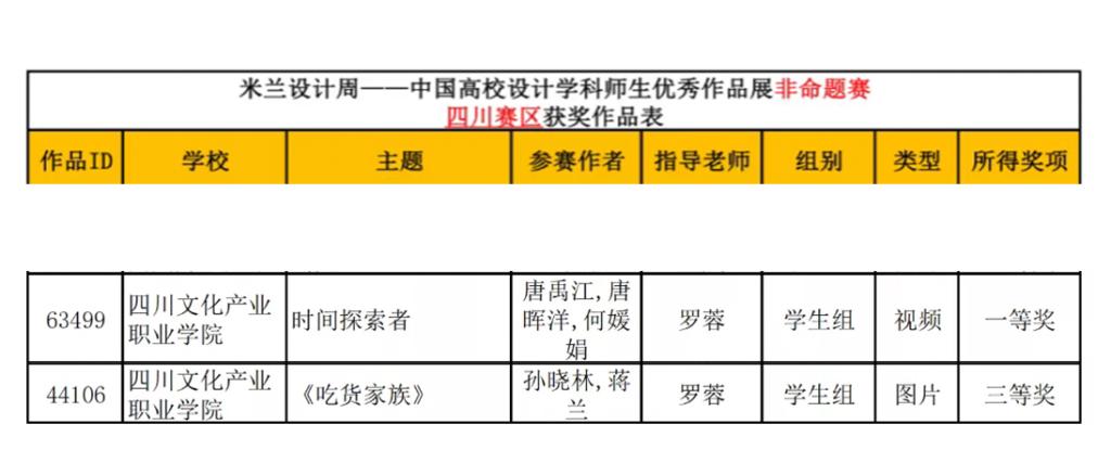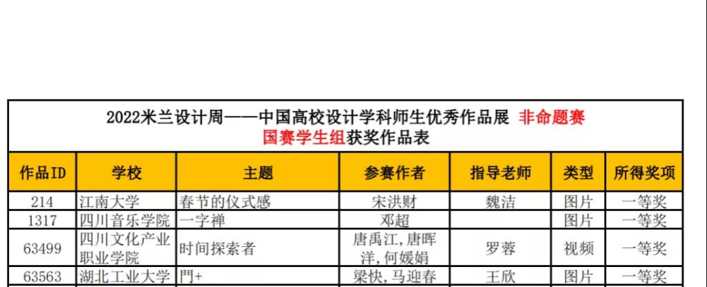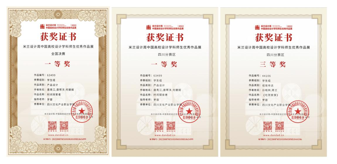 2022年6月9日,第六届米兰设计周——中国高校设计学科师生优秀作品展国赛评选落下帷幕,我校文博学院19级产品专业学生唐禹江、蒋兰、孙晓林同学在产品专业教师罗蓉指导下获得国赛一等奖1项,省赛一等奖1项、省赛三等奖1项。