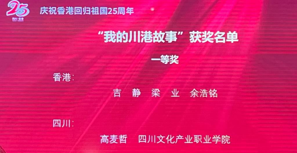 四川文化产业职业学院参加了川港交流系列活动之庆祝香港回归25周年“我的川港故事”作品征集展示活动,我校选送的“共话归来情·同寻中华根”汉语普通话研习及文化交流港标课程记录片在100多个小视频参赛作品中脱颖而出,获得了一等奖并在启动仪式上公布。