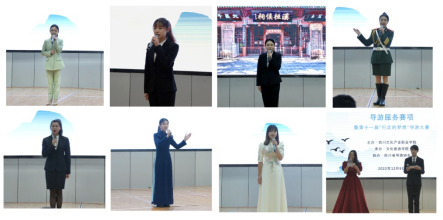 在专题导游词创作与现场讲解环节,选手们针对政务团、商务考察团、中学研学团、老年团、亲子团五个团型和民族传统节日、工艺美术、饮食文化、历史文化、建筑艺术、古典园林艺术、表演艺术六类主题文化创作了专题导游词并进行现场讲解。在自选景点讲解环节,10位选手从不同的文化切入点对大足石刻、汉桓侯祠、都江堰水利工程、峨眉山、扬州瘦西湖、碧峰峡大熊猫研究基地等众多景点进行了精彩的现场讲解。在导游才艺运用环节,选手们结合导游带团活跃气氛的场景,通过黄梅戏、皮影、胡旋舞、贯口、唱跳、茶艺、朗诵等方式为现场师生呈现了一场精彩的文化盛宴。