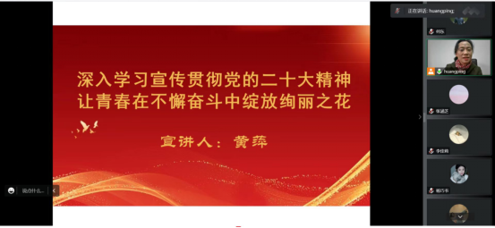 12月9日,校党委委员、副院长黄萍以“深入学习宣传贯彻党的二十大精神 让青春在不懈奋斗中绽放绚丽之花”为主题,为2022级移动商务管理学生进行授课。她结合同学们的实际,先后从报告的主要内容、重要意义以及同学们应如何践行党的二十大精神解读了党的二十大报告。告诫同学们“要坚定不移听党话、跟党走,怀抱梦想又脚踏实地,做能文善商的文商人。” 同学们纷纷表示,在今后的学习中将更严格要求自己,用己所学为国所用,争当伟大理想的追梦人。