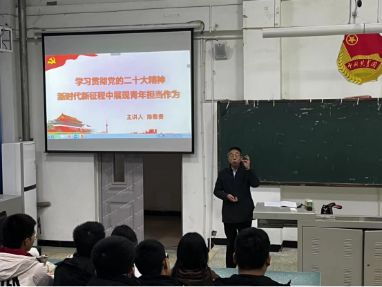 12月5日,校党委委员、副院长陈敬贵以“学习贯彻党的二十大精神 新时代新征程中展现青年担当作为”为题,为2022级大数据学生进行授课。他围绕三个深刻把握展开:一是深刻把握十年来新时代所取得的重大成就;二是深刻把握中国式现代化道路的深刻内涵;三是深刻把握应对风险挑战的重要要求。他对同学们提出了四点希望,希望同学们有青云之志、勇做时代新人、勇于担当作为、有勇气面对风险挑战。
