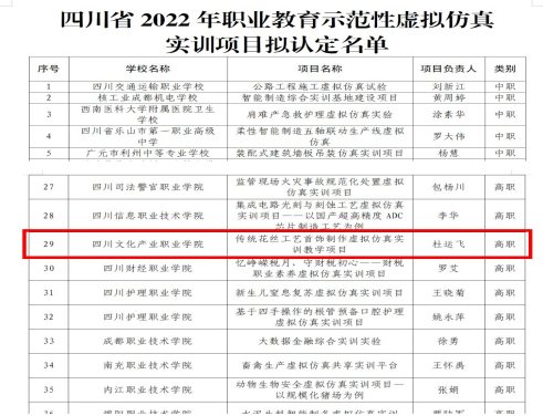 近日,四川省教育厅发布了关于四川省2022年职业教育示范性虚拟仿真实训项目拟认定名单的公示。经各方评审,拟认定四川省2022年职业教育示范性虚拟仿真实训项目50个。其中,拟上榜中职学校有13所、高职有27所院校拟认定。我校“传统花丝工艺首饰制作虚拟仿真实训教学项目”经专家评审被评为四川省“省级职业教育示范性虚拟仿真实训项目”。
