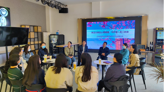 文旅学院党总支书记田娅简要介绍学院学情和专兼职辅导员工作开展情况,学工部副部长、大学生心理健康中心主任方寒俐就文化旅游学院学生心理健康工作站的建设、学生心理危机事件的处理及今后学生心理健康育人工作开展作工作交流指导。