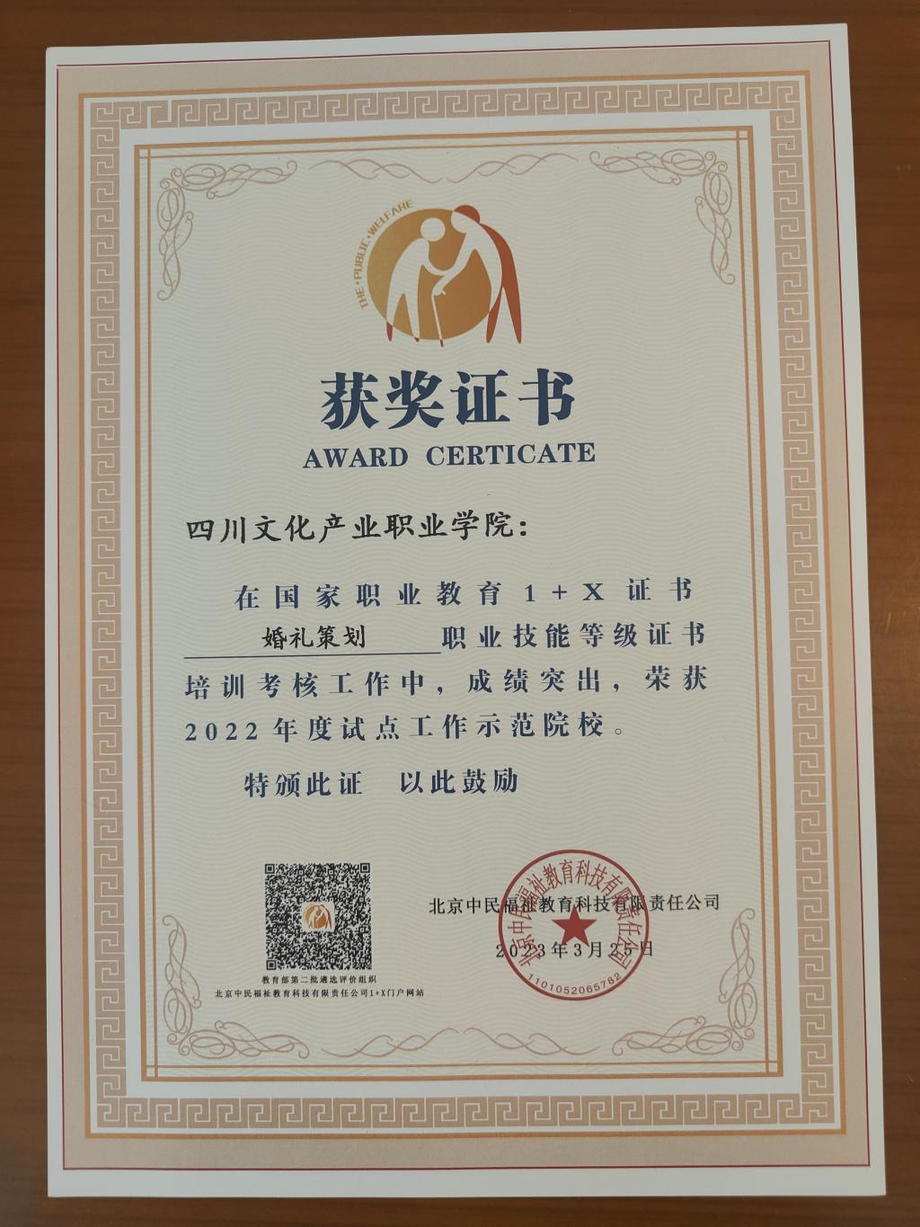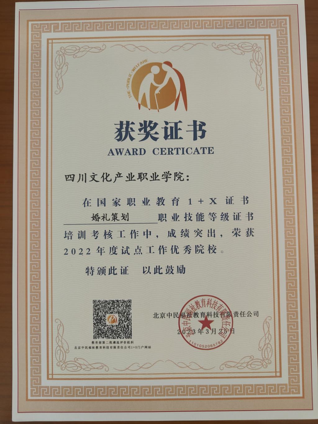 本次表彰面向全国证书试点单位评选出10所婚礼策划证书示范院校、8所优秀试点院校。文博学院婚庆服务与管理专业高度重视1+X证书试点工作的开展,在2022年组织1+X婚礼策划证书考试中,通过率100%,获1+X证书试点评价组织一致好评,全面提升婚庆专业人才培养改革创新,推进岗课赛证融通建设,为职业教育的产教融合赋能。