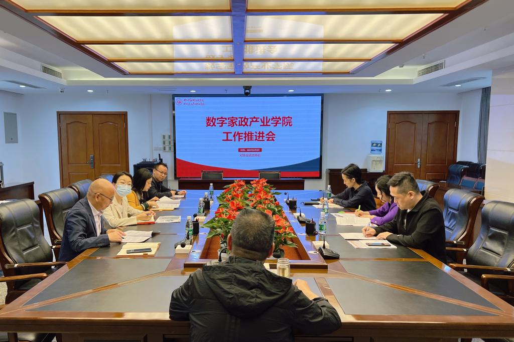 2023年5月8日,在明慧楼217会议室举行了数字家政产业学院建设工作推进会。会议由校党委副书记、纪委书记何强主持,四川省巾帼家政发展促进会、四川跨客通科技有限公司总经理和对外交流合作处、教务处、招生就业处、文化旅游学院负责人和相关人员参加了此次会议。