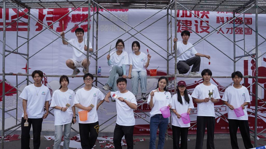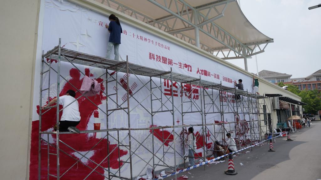 绘画现场,师生热情高涨、铆足干劲,将对党的满腔热爱落在了每一道工序上。经过大家的协作努力,原本普通空白墙变成了一面波澜壮阔的党的二十大精神文化宣传墙,让原本冰冷的墙面有了“灵魂”,墙面上的一排大字“科技是第一生产力、人才是第一资源、创新是第一动力。”形象生动地再现二十大关于深入实施科教兴国战略、人才强国战略、创新驱动发展战略的核心精神。