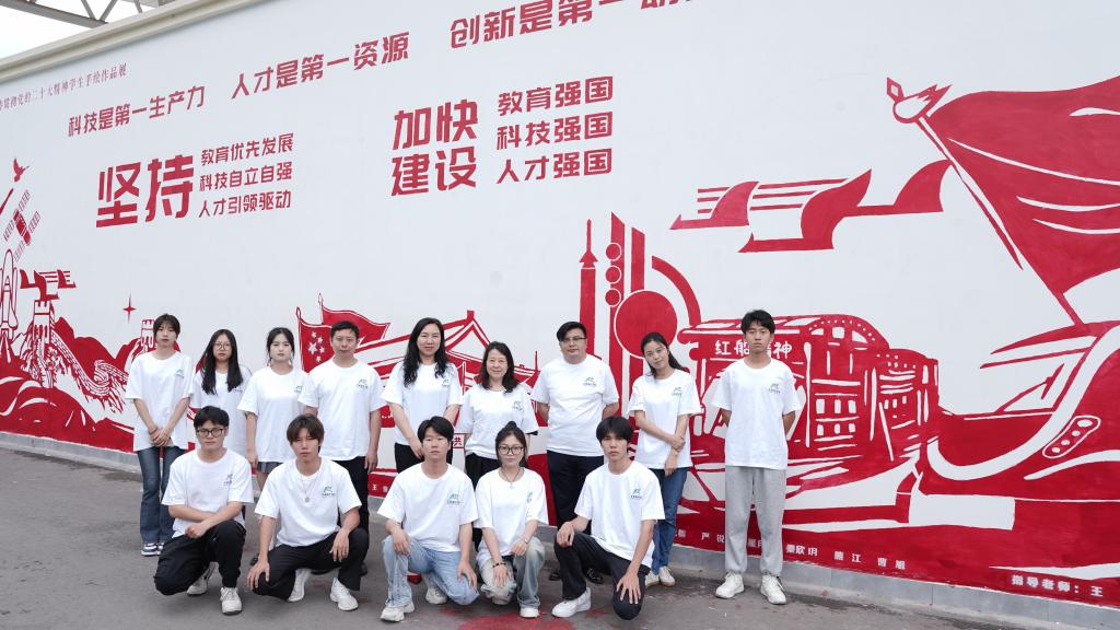 艺术设计学院教工党支部以深入学习宣传贯彻党的二十大精神为契机,以足球场空白墙壁为主阵地,绘制二十大精神文化墙,让党建工作“动”起来,让党建阵地“活”起来。绘制前期,校党委委员、副院长朱霖、宣传统战部、艺术设计学院党总支和指导教师就墙绘内容、构图和绘制细节进行了多次沟通;指导教师充分学习研究党的二十大报告关于科教兴国战略指导精神,深刻理解精神内涵与实质,与设计小组反复沟通、改进设计稿,精心打造“高颜值”二十大精神文化墙,积极营造“处处是课堂,时时悟党建”的浓厚氛围,力争在手绘墙上留下最美的画面。
