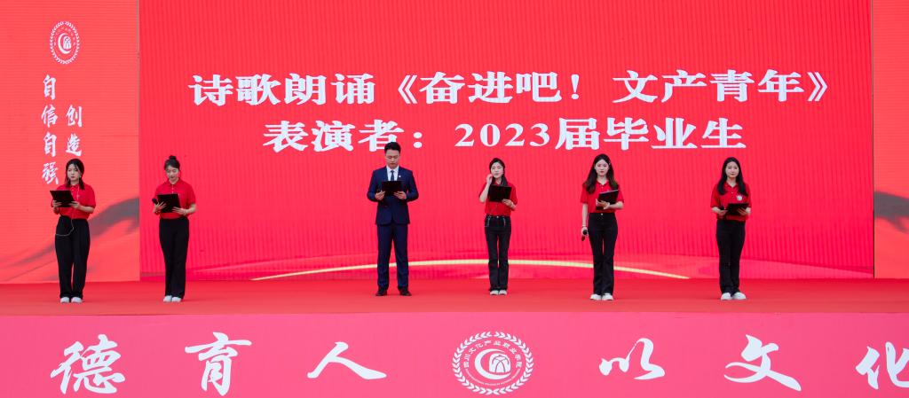 毕业典礼最后,一篇题为《奋进吧!文产青年》的毕业生原创诗歌,一字一句诉说着他们的美好大学生时光,一分一秒流露出依依不舍的离别之情。一曲《未来我来》的毕业生组合演唱,体现了文产青年告白祖国、向未来报到,感党恩、跟党走的坚定信念,他们展示了文产人朝气蓬勃的精神风貌和拼搏向上的责任理想!