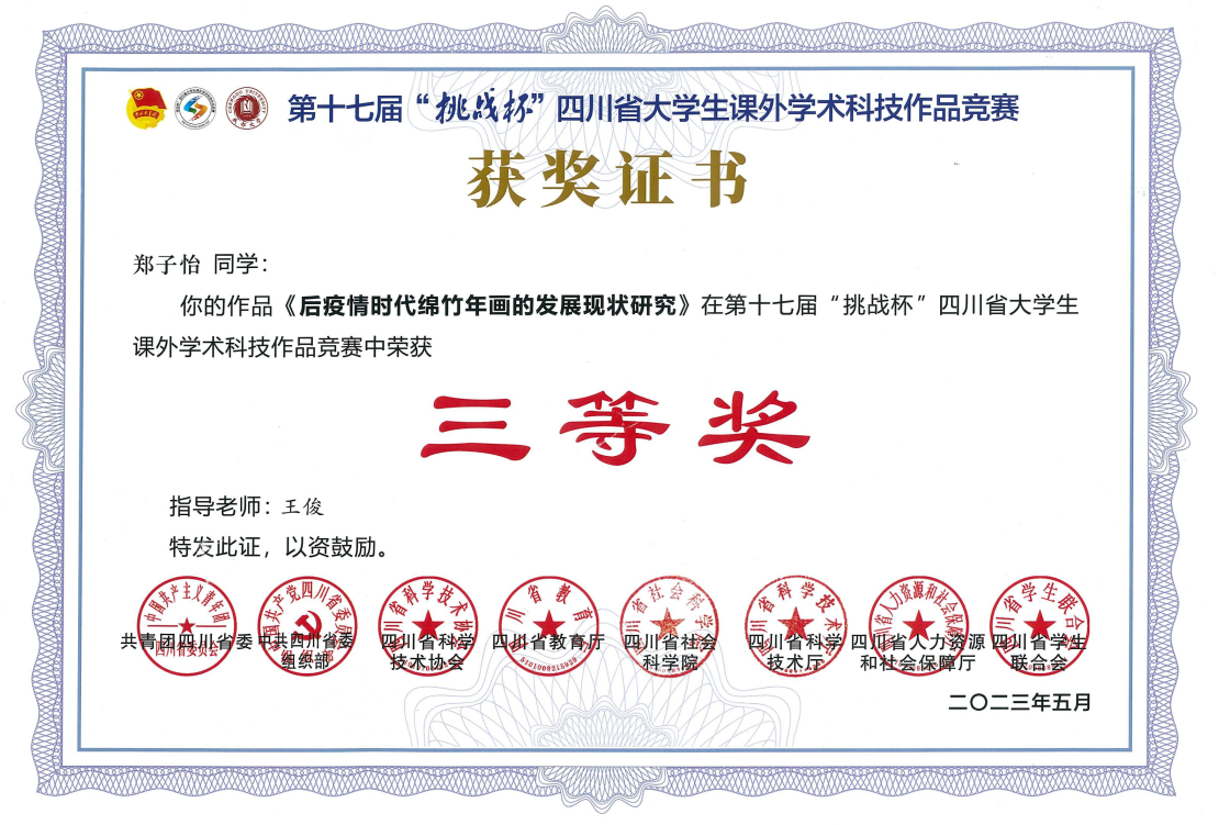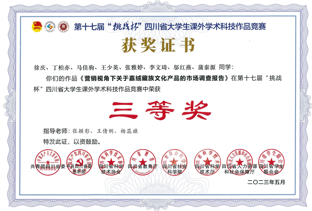 本届大赛由团省委联合省委组织部、教育厅、省科协、省社科院、科技厅、人力资源社会保障厅、省学联共同主办的。我校根据团省委文件要求,共推报省级参赛项目3个。其中,文化商学院的《营销视角下关于嘉绒藏族文化产品的市场调查报告》项目,艺术设计学院的《后疫情时代绵竹年画的发展现状研究》项目顺利通过省级网络评选和终审现场答辩,并最终获得铜奖。