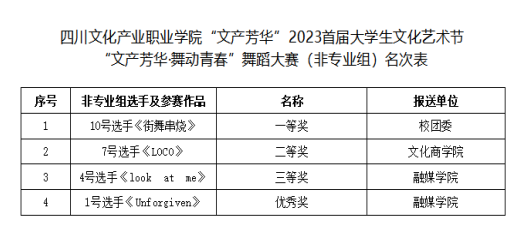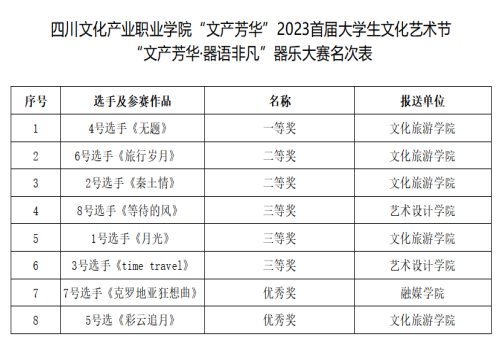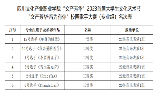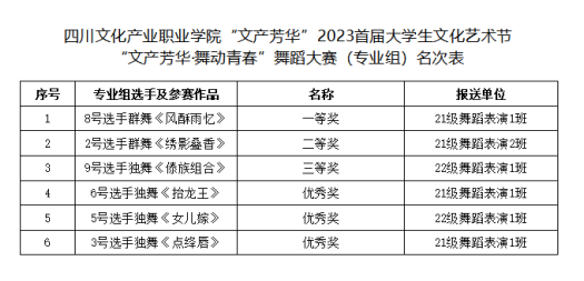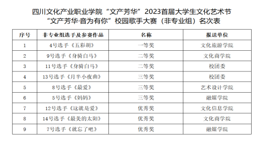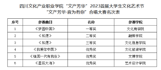 根据四川文化产业职业学院“文产芳华”2023首届大学生文化艺术节相关安排,由校团委主办、文化旅游学院承办的首届“文产芳华”合唱、舞蹈、歌手器乐大赛决赛于6月15日—17日在文星湾足球场举行。