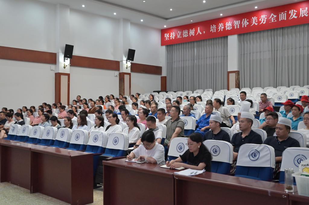最后全体后勤员工庄严宣誓:将以高度的责任心、过硬的专业技术、良好的服务态度、廉洁自律的职业操守,全力以赴为师生提供优质、高效的服务,展后勤风采,树文产新风!