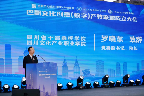 4月12日,巴蜀文化创意(数字)产教联盟成立大会在四川文化产业职业学院隆重召开。四川省委宣传部副部长、省电影局局长、省作家协会党组书记张伟,重庆市文化和旅游发展委员会党委委员、二级巡视员赵明全,四川省教育厅二级巡视员杨建国出席并讲话。四川中华职教社社长王小晴、成都市双流区人民政府、巴中市委宣传部、贵州省毕节市纳雍县人民政府、夹江县委宣传部等负责同志出席。四川文化产业职业学院党委副书记、院长罗晓东致辞。来自成渝地区各理事成员单位及校企合作代表200余人参加。大会审议了联盟章程、联盟理事单位名单,向理事长单位授牌,向专家委员会代表颁发聘书。