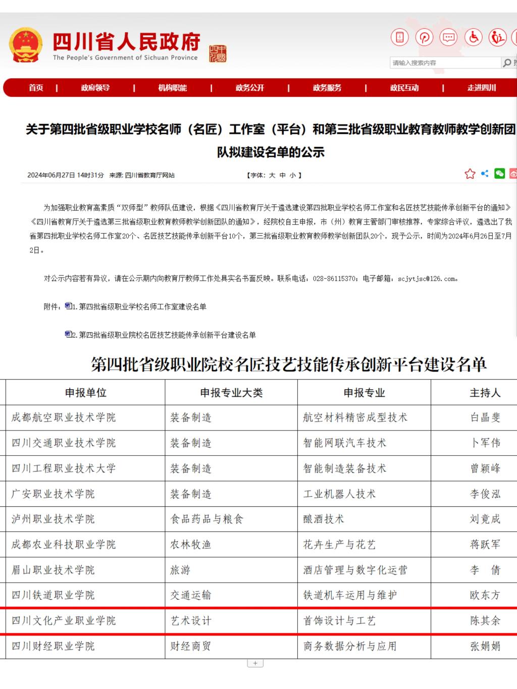 近日,四川省教育厅公布关于第四批省级职业学校名匠技艺技能平台建设名单。经专家综合评议,全川共计评选十所高校入选,我校文博学院教师陈其余领衔申报的该项目成功入选。