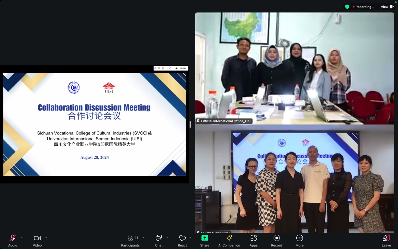 会上,双方围绕办学理念、优势专业、国际项目等方面介绍了各自学校的基本情况,就共建中国-东盟融媒体技术人才培训基地、线下培训讲座、师生交流与联合培养等项目合作深入交流,并达成初步共识。印尼精英国际大学国际处主任鲁斯蒂卡莎莉·努格拉赫尼女士表示,非常期待与四川文化产业职业学院在课程平台共建、联合科研、师生互访、技能培训、人才培养等多个方面展开深入合作。双方将在9月线下会晤中继续共同探索和推动具体的合作项目。