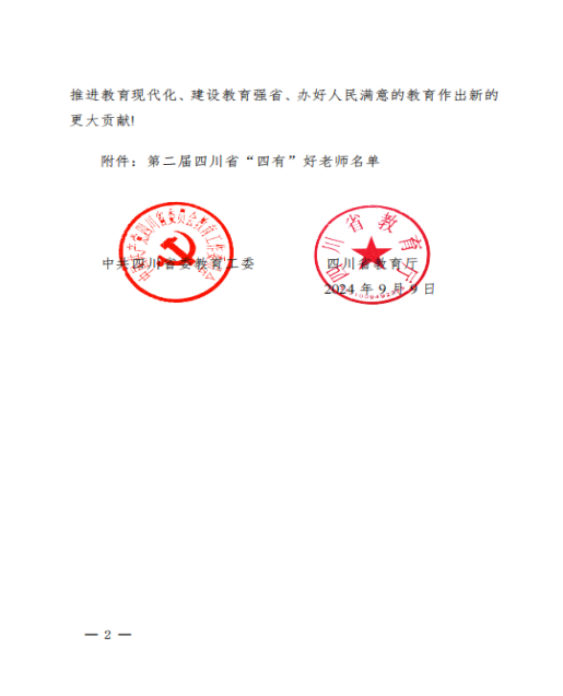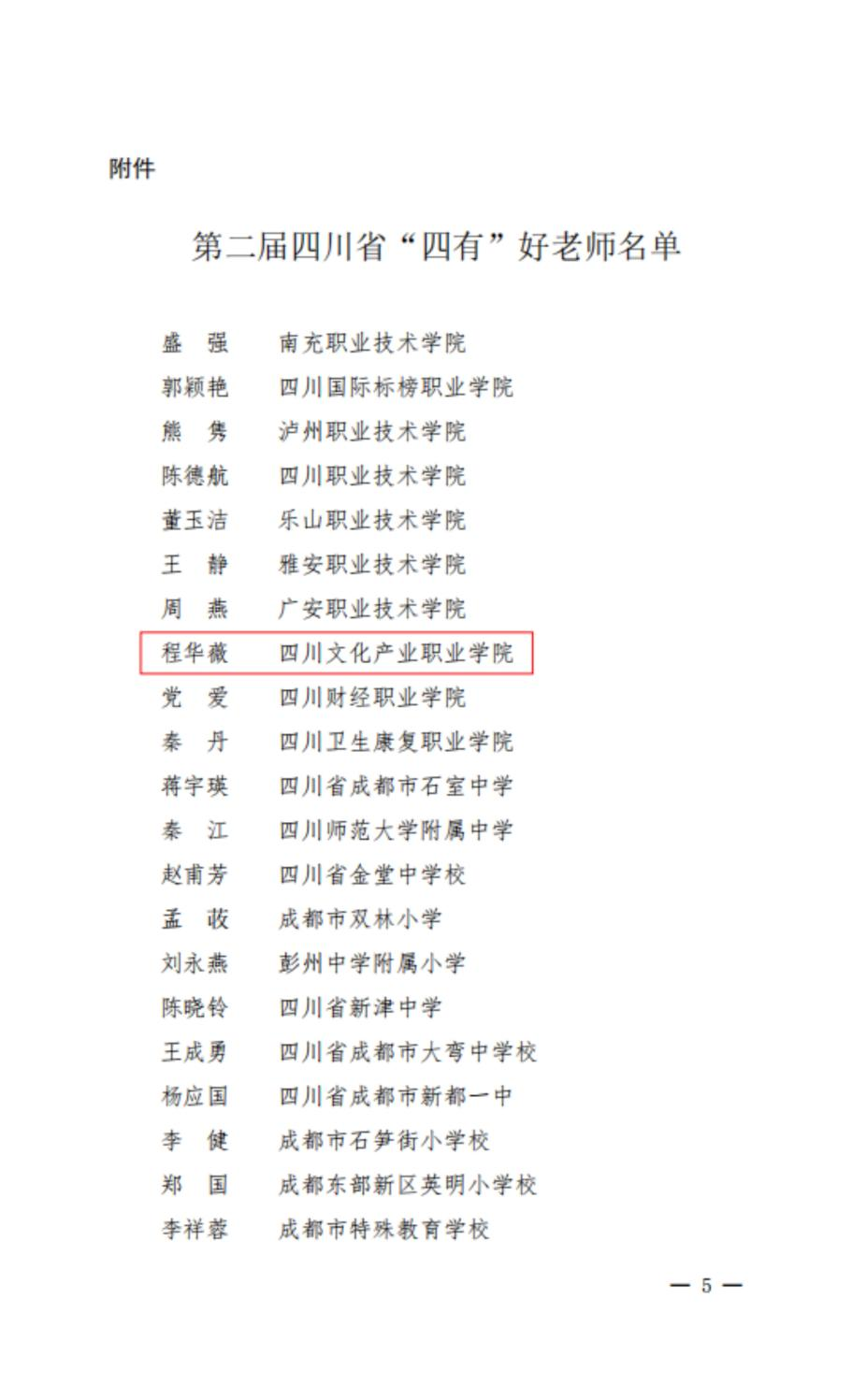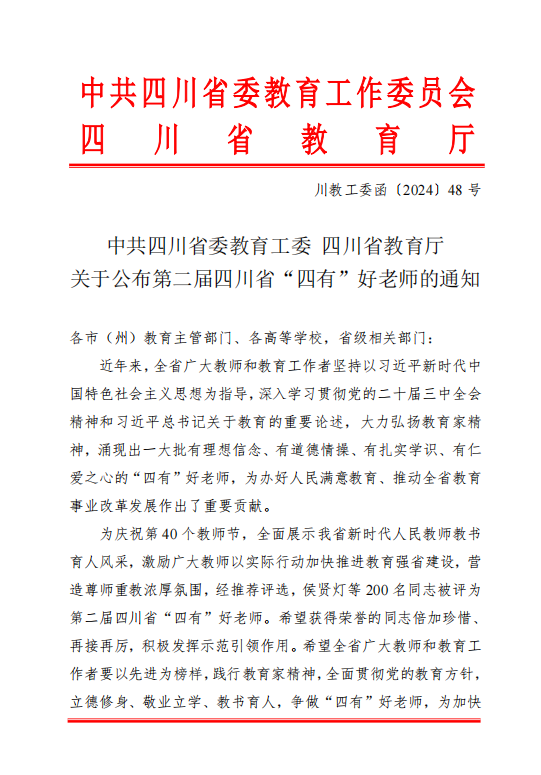 近日,由中共四川省委教育工委、四川省教育厅组织评选的第二届四川省“四有”好老师结果公布,我校专职教师程华薇副教授荣获第二届四川省“四有”好老师荣誉称号。