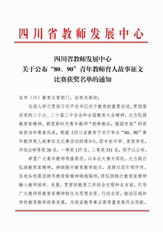 根据《四川省教育厅关于举办“80、90”青年教师育人故事征文比赛活动的通知》文件精神,我校于5月11日—5月31日在全校范围内积极开展征文活动。经过前期筛选,将推荐征文按照文件要求按照典型案例、实践经验、研究报告、教育故事四种文章类别统一汇总上报。