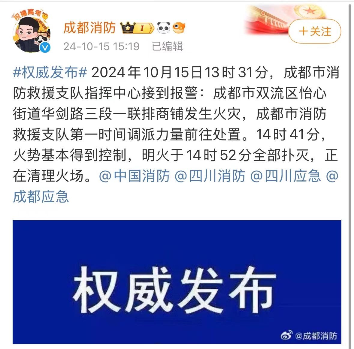 2024年10月15日13时31分,成都市消防救援支队指挥中心接到报警:成都市双流区怡心街道华剑路三段一联排商铺发生火灾,成都市消防救援支队第一时间调派力量前往处置。14时41分,火势基本得到控制,明火于14时52分全部扑灭,正在清理火场。