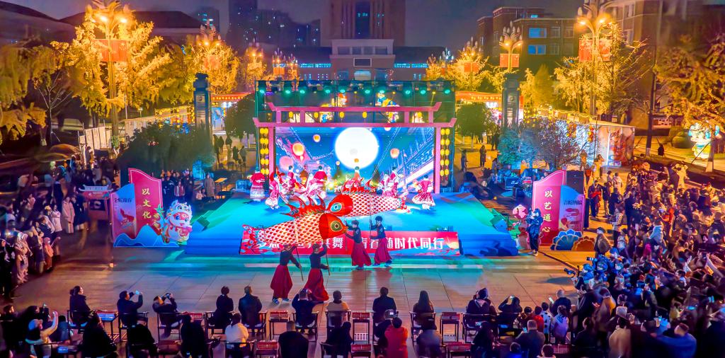 主舞台区展演以《国潮舞》开场,聚焦“国潮”主题,演员身着带有中国传统图案的刺绣服装,加入舞狮舞龙的热闹场面,充分展现出国潮魅力。舞蹈作品《春嬉》的展演,生动呈现出女子在春天里嬉戏玩耍的和谐景象,同时表达了对广东省潮汕地区特色民间舞蹈的尊重与传承。声乐作品《卖扁食》以喜庆丰收为背景,欢快的音乐节奏加上独具河南地方特色的方言,表达出丰收的喜悦。舞蹈展示《雨润天府》,以优美的舞姿展现出天府之国的润泽与灵动。