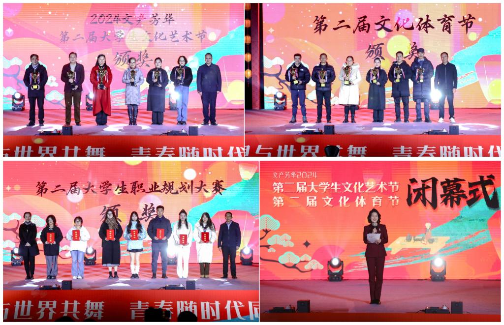 我校于4月-12月组织开展“文产芳华”第二届大学生文化艺术节,12月3日—4日举办了第二届文化体育节。本届艺术节用8个月时间,共组织开展18个校级品牌项目、6个院级品牌项目。本届体育节融入开幕入场式展演、校园欢乐跑等多个创新赛事,取得多项突破性成绩。闭幕式上,校领导为相关奖项进行颁奖,其中,文化旅游学院获得第二届大学生文化艺术节和第二届文化体育节团体组织一等奖。闭幕式上还对我校第二届大学生职业规划大赛获奖选手及指导老师进行了表彰。
